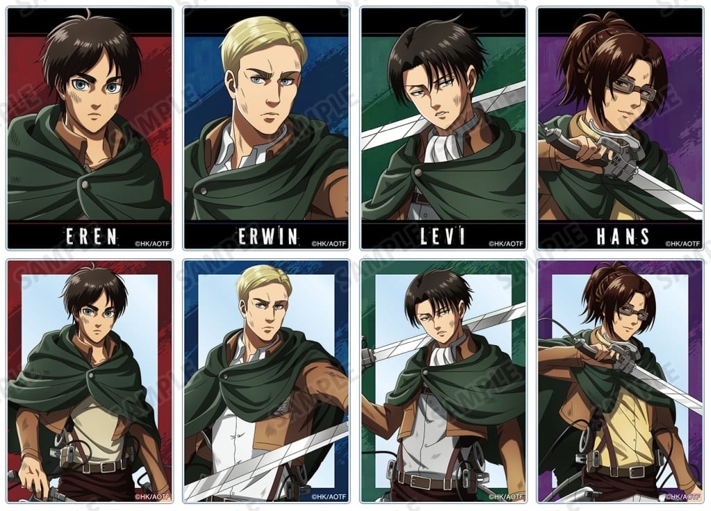 概要 | こちらの商品は、BOX販売(1BOX8個入り)となります。 TVアニメ『進撃の巨人』より、トレーディングアクリルカードの登場です。 【商品詳細】 <キャラクターラインナップ> |
